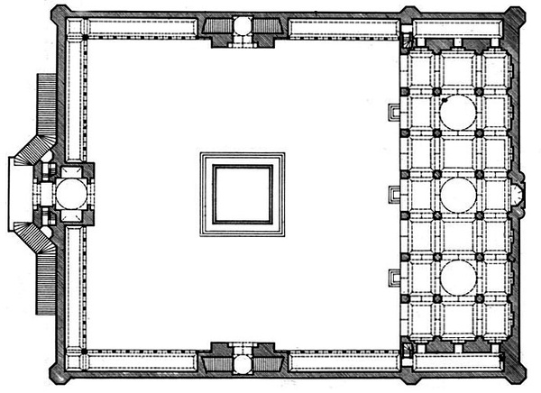 艾哈迈达巴德的贾玛清真寺是印度最辉煌的清真寺之一,建于公元1423年,由国王苏丹阿默德沙罕建造。建筑材料为黄砂岩,混合了印度教与穆斯林的建筑风格。它位于城市游行中轴线南边,处于老城的心脏地带。由260颗柱子支撑的贾玛清真寺有15个拱顶。建筑群中央是一个长75米、宽66米的庭院。庭院三边由柱廊围绕,而祈祷大堂占据了第四边——东边。这个庭院相互连通、有柱廊和布道的建筑群就像一个完整自足的整体。