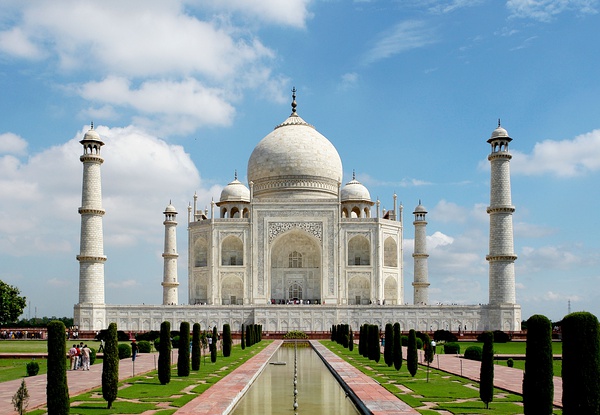 大门与陵墓用一条宽阔笔直的用红石铺成的甬道相连接,左右两边对称,布局工整。在甬道两边是人行道,人行道中间修建了一个“十”字形喷泉水池。泰姬陵最引人瞩目的是用纯白大理石砌建而成的主体建筑,上下左右工整对称,中央圆顶高62米。泰姬陵的构思和布局充分体现了伊斯兰建筑艺术庄严肃穆、气势宏伟的特点,堪称一件完美无缺的艺术珍品。