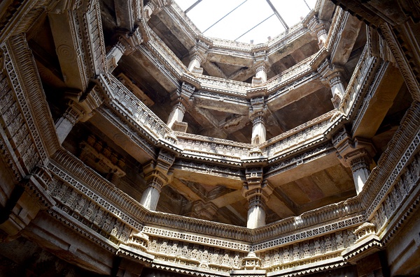 阿达拉杰阶井是穆斯林国王穆罕默德巴格达为皇后所修建,有五层深,平面呈希腊十字。每一层都是可容纳许多人集合的巨大空间。阶井达到地下水的深度,以平衡水平面季节性的波动。顶部的平面呈八边形,由大量精雕细琢的支柱支撑。当人沿着阶梯走向圆井,八边形的空间就慢慢在眼前展开。古吉拉特邦有上百个这样的阶井,但阿达拉杰阶井是其中最出色的建筑之一,它融合了印度教的手工艺与伊斯兰建筑中的植物与几何图案。