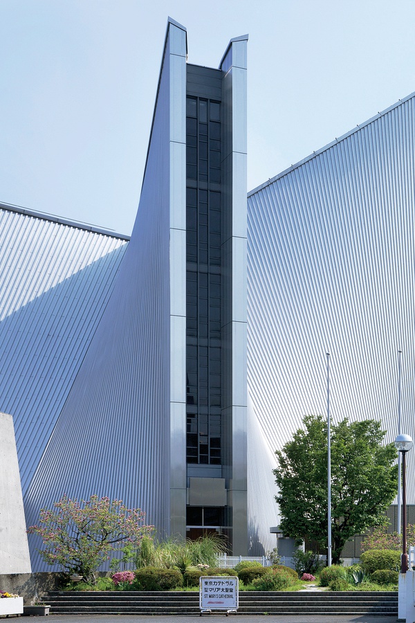 东京天主教圣玛利亚大教堂是东京都文京区关口教会的教堂。从上空(神的视角)俯瞰建筑,顶部是十字架的形状,底部是菱形的展开。外墙铺有耐腐蚀的不锈钢板,内部地面铺设大理石。4种共8张的混凝土双曲面壳体,每两张组合构成了教堂的主体。由于顶部是十字架状的天窗,所以墙体之间通过梁来互相支撑。