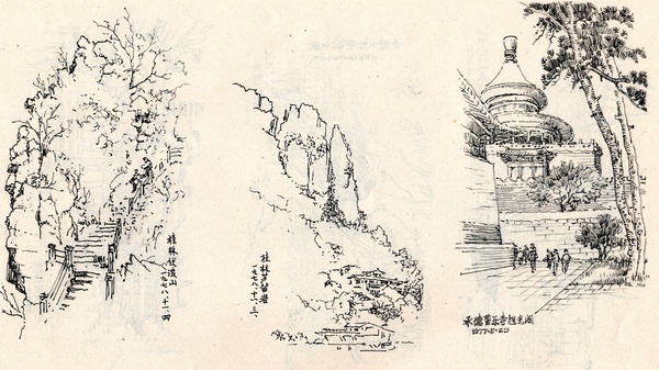 杨廷宝先生从青年时代就养成了“画日记”的好习惯,遇到大自然中优美的风景或是有艺术性的建筑就随手勾出来。这即成为他从事调查研究的主要方法,也大大提高了他的绘画技能。他随身携带有三件宝,“笔、小本、钢尺”,随时备用,终身持之以恒。速写让杨先生开阔了视野,也使得他对尺寸比例都极其敏感,手就像比例尺一般精准。