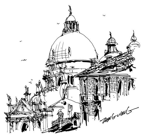 钢笔速写作为基本功,多用于创作前的小稿,或者设计草图。而中国钢笔画研究会副主席、中国建筑学会会员唐亮,始终耕植钢笔画中,尤其对西方传统古典建筑写生,用大雅纯美、潇洒自如的线条刻画出精准繁复的艺术品,将传统小幅面的建筑钢笔速写打造出一片崭新天地。在随处充满都快门声的当下,唐亮仍坚持挥笔,用劲挺爽朗的线条和色块雕琢着空间沉淀出的韵律和古典美。