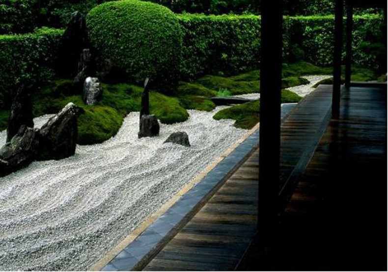 最后会讲到一个园林是大仙院。我觉得日本的庭园,当我们去看这种大型的空间,像这种修学院离宫或者桂离宫这样的大型的空间,必不可少要去做回游,(模拟)自然的这种,跟中国园林有一点相近的方式的时候,其实日本人是非常缺乏手段的,你永远会看到非常城市化的一种处理。其实日本的禅宗庭园才是代表了它的园林(艺术)的极致,那么这个大仙院是禅宗庭园的一个非常典型的代表,在一个方丈庭的周围,用一个方寸之地营造的一个山川归于大海的意向。从几个蛭石所开始的这种深山的幽泉,一直到汇成一个急流,然后汇成一个像湖面一样的水面,一直到方丈的正庭变成一片平静的大海,以及大海当中的几个仙山……这种(庭园)代表了日本的静观庭园,禅宗的这种空寂的追求的一个极致。当然这个当中有很多和中国的宋朝的审美方式的一种对话。这种方式其实在中国的文人庭园当中已经是看不到的,因为大家走了两条路。在这样的禅宗庭园,其实不单单只是关心周围的理解,当你人安坐在这个廊下的时候,你所能够体验到的这个世界对你的一种包围和一种呵护,这样一个成就其实是和中国人造园一样的,它所营造的是一个安放身体的更多的归宿。
