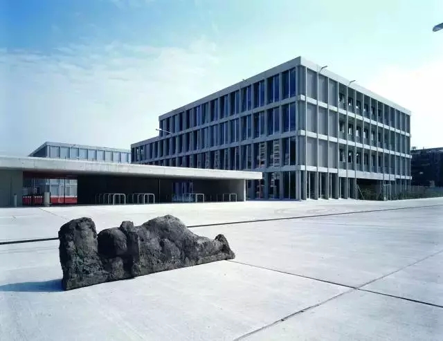 在苏黎世北区的学校里,各建筑要素是“得以成立”的。建筑立面由竖立的无帽壁柱(译注:Lisene : pilaster without capital and basis)与横向梁构成,传达了传统的承重与支撑。而立面有大开洞的位置,梁高便相应增加。屋顶处也拥有较高的梁,朝向天空结束建筑体量。无帽壁柱立于一片薄的横板,横板定义了建筑在空间中的场所。由无帽壁柱的纤细尺度以及对构造缝的刻画可清晰阅读出立面的悬挂逻辑。最后,环绕建筑均布的、基于格网体系构成的立面表达了建筑内部的结构,一个由柱与无梁板构成的框架结构。同时这样的立面也赋予这一建筑作为公共设施的表达。