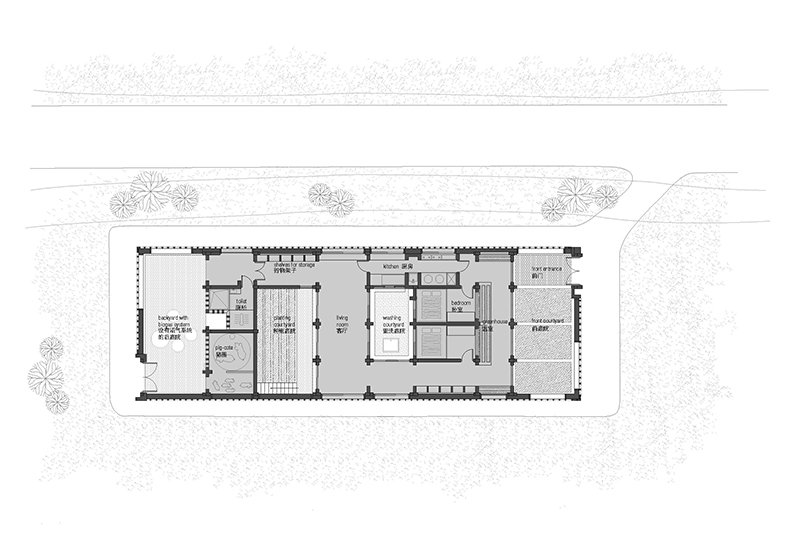 内部庭院是中国傳統房屋的一個重要元素,其正好诠释了农村人们的生活方式。我们设计的房屋建筑原型嘗試革新内部庭院的空間,令其與生活更息息相關。四个功能不同、各有特色的庭院空间,分別被插进整个住宅的主要功能空间,即厨房、厕所、客厅以及卧室之中,仿佛整个房子是绕着这四个庭院而建的。