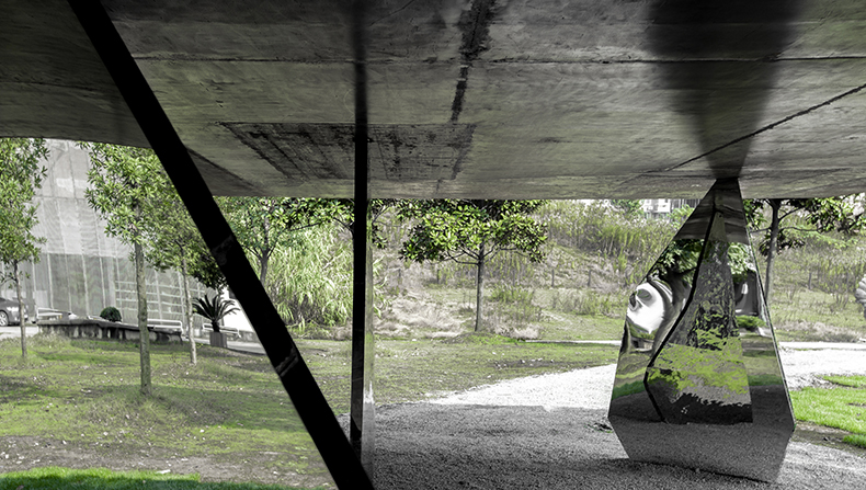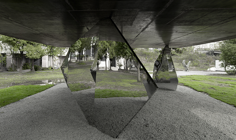 然而建筑师在确定支撑位置时并非依据的结构最合理原则,此时在建筑师脑中的是一个由假山的“切片”来支撑及限定的空间,就像艺术家对待薄片不锈钢的材料手法一样,工程学的支撑结构被带入了假山的空间意味,建筑师将艺术家的不锈钢假山雕塑,分解及转换为一个抽象的假山般的空间。艺术家特意选择了山石拓片肌理的不锈钢作为切片一侧的表面,周边的树木花草被模糊化地带入了这个花草亭中。