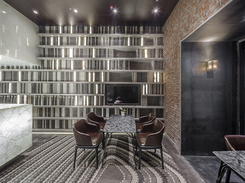 小型的餐厅、酒吧和咖啡厅在旁边的一个空间中类似的被几个平面分割开来,这里是设计师和石材商沟通和休息的空间,所以还融合了一个小型的图书墙。在这里设计团队非常关注家具对使用者的感受,几乎用石材为原料重新设计了除椅子外所有的家具,试图展现石材在室内中的崭新的表现能力,一个绵延的织物般的石材铺地将这三个功能融为一体。