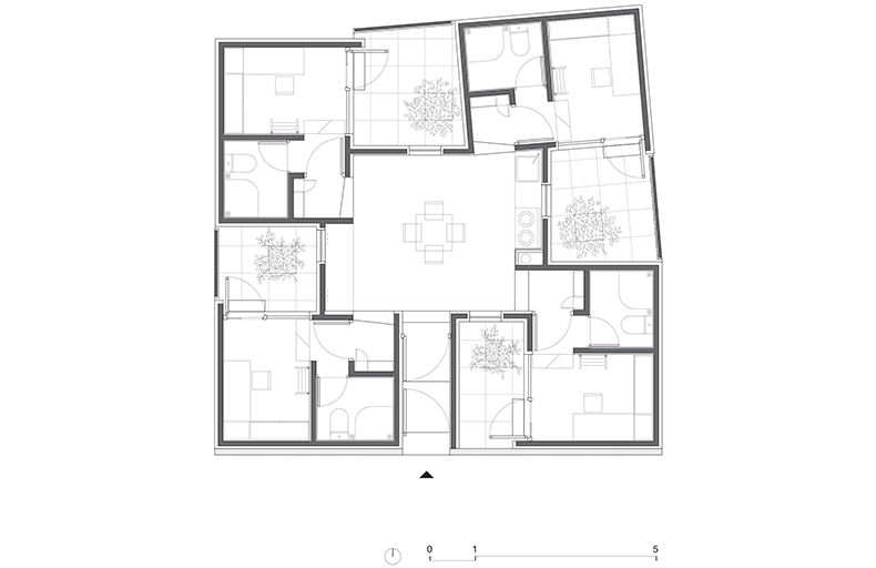 传统四合院里位于中间的院子是当之无愧的中心,所有的房间都朝向它。这种空间布局对应着传统的家庭生活,不再契合今天青年人的个人生活模式。个人生活的核心是私密性,所以我们的想法是将场地分为四组空间,每组包含一个房间和一个私人小院,它们各自朝向不同的方向,最终共同构成一个风车状布局。通过这种方式,每个房间和院子的私密性都得到保护。对比于传统四合院,本项目以四分院命名。从“合”到“分”的变化揭示出社会结构和生活模式在住宅中的转变。