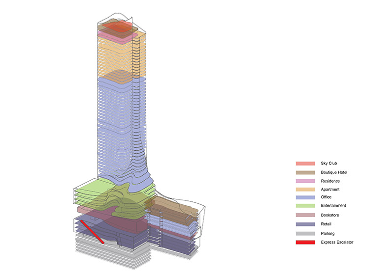 有方: 整座超高层中,除了新华书店,还有空中文化广场、商业零售、公寓、办公及精品酒店等功能,通过多功能来激活商业的设计手法(类似于香港的希慎广场),对于本超高层建筑的的此设计做法,有无哪些突出的特点?