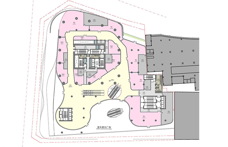 本项目的底层商业、中层书店、中高层餐饮娱乐以及高层中转提供了与商业、景观、城市、文化、活动结合的复合场所,与地面的解放碑广场成为吸引人们聚集的一系列开放城市空间。同时,项目中大型飞天梯,为到达不同高度的商业提供了便利,同时也使不同部分营业时间有了独立性,消费人群在复杂的环境中更倾向于明确的路线。