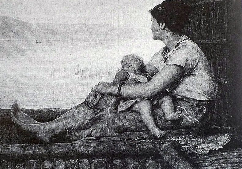 也是在那届法国举办的世界博览会上,瑞士联邦政府为了渲染民族共同体意识,以及配合展出的考古新发现,邀请了纳沙泰尔籍画家奥古斯特·巴舍兰,以史前先民的日常生活为主题,绘制了石器时代和青铜时代两幅想象的湖上住居图。巴舍兰不仅回应了西方绘画传统中的阿卡迪亚主题,而且建立了纳沙泰尔地区绘画的一个新传统;浪漫化的湖上住居。这个传统,在之后一代代本地画家的作品中不断地得到延续和重新演绎。巴舍兰的朋友阿尔伯特·安卡(Albert Anker)作于1873年的一幅画的前景中,一位丰腴的少妇,怀抱着沉睡中的孩儿,安坐在湖上住居的平台之上。烟波渺茫的湖水和隐约可见的远山,衬托着湖中一叶扁舟,那急切的眼神,是在盼望着打鱼的夫君驾舟归来?一丝远古的温情和一种卢梭式未被文明污染的浪漫怀想,弥漫在整幅绘画的空间之中。