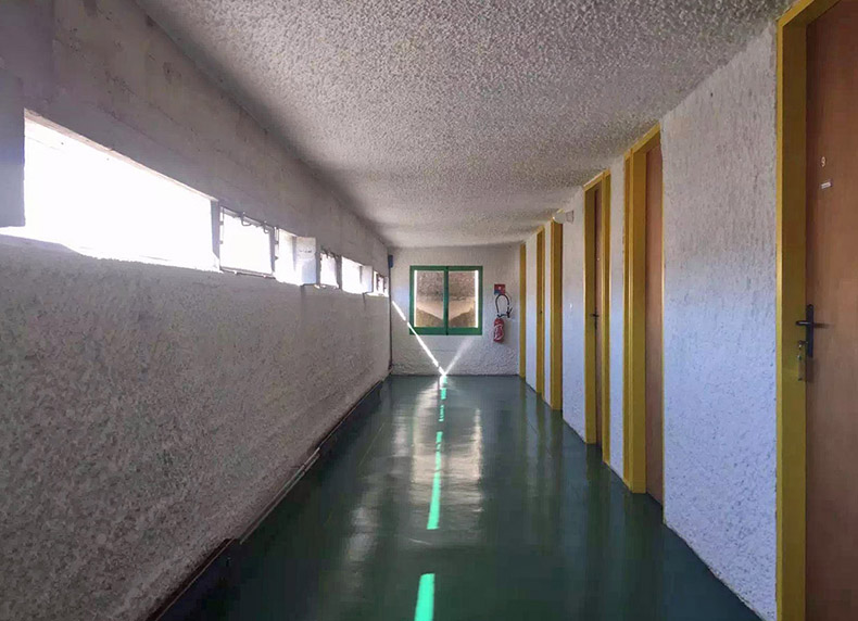 拿到钥匙后,大家各自回房间放行李,这时候的空间对应的是“个人生活”。一条狭长的走廊,左面是长条形开窗,右面是一排单人房间。房间的门锁有点旧了,因此转动、开门的时候还会有些声响,幸好整层都是团队自己人,但愿没有影响到修道院里其他人休息。整个居住空间布局工整,虽然有些旧,看起来却很干净。