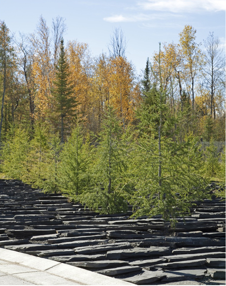 黑色的花岗岩片石,一片片工整的叠铺在地面上,表面粗糙,形态各异。阳光给单一重复的表面增加了新的维度,粗糙的质感和片石的阴影,每一层打在下一层上。连续的黑色界面上生长着成排的北美落叶松,为后面大片的天然白桦林搭建了前景。