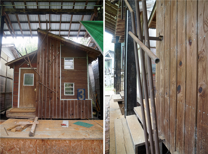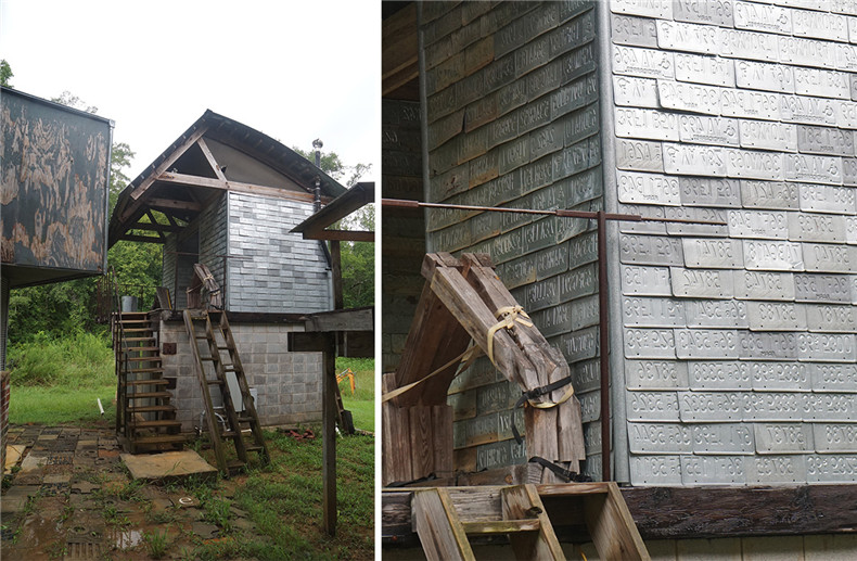 超级棚屋朝向3个特殊的小建筑倾斜——一个堆肥厕所和两个淋浴间,其中一个封闭、另一个顶部开放。正如它们所属超级棚屋和豌豆荚综合体那样,淋浴间和厕所也是形状和材料的混合:厕所,栖息在包含堆肥机制的混凝土块基础上,表面由旧车牌覆盖,银色的一侧朝外,像瓦片一样排列,顶部是一个长而浅的山墙。封闭的淋浴间,是一个T型的金属结构,伫立在一个圆形的砖基础上;开放的淋浴间则是一个砖和玻璃碎片的圆筒。