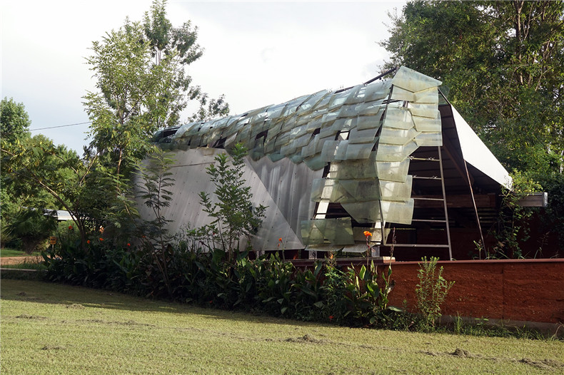 像大多数乡村工作室的建筑一样,社区中心是对学生们智谋的考验。夯土墙30%是黏土、70%是沙石。它们的混合物,加上硅酸盐水泥,被倾倒入6×8英尺的形式里——他们将它称为升降机——并用一个空气带动的夯进行压缩。由于没有购买玻璃的预算,学生们想到了回收汽车挡风玻璃的办法。Schumann了解到在他的家乡芝加哥有一个废料场,允许顾客拿走任何他们可以拖走的东西。他花费了120美元,拿到了80块雪佛兰汽车的挡风玻璃。