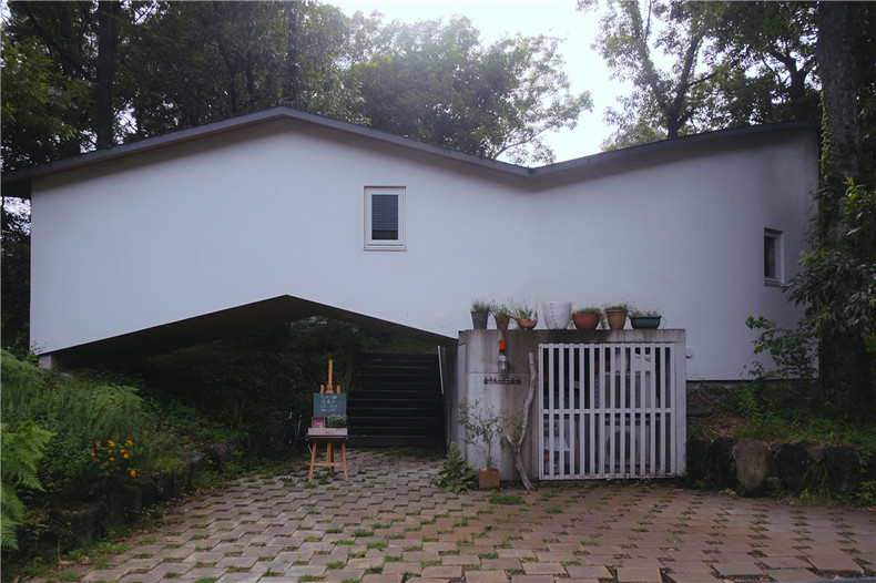 他们设计的IzuBook Café坐落在人流稀少的伊豆半岛的乡间,这间咖啡馆明明更像是主人的家,尽管有开敞的咖啡和阅读空间,但无人来访或者客人已经落座的时候,主人就在端头的狭小工作室里埋头做自己的事情,而弧形体量中间围成了一个庭院,在铺地上运用棋盘或是格栅的形状,让自然透过地面的植物显露出来,一人独立其间所能感受到的被树林和土地包裹的氛围,大概就是犬吠所说的“仅仅只为一个人营造的公共空间”。