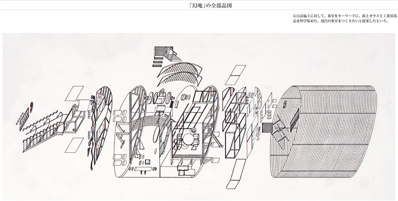 波形板圆筒型住居的提案者是川合健二。石山从川合邸的设计中看到能源、环境和住宅在精密的机械中通过技术的力量解决了居住问题。当石山收到委托在家乡建造一座兼做茶室的住宅时,他提议完全用钢铁、玻璃和工业用部件的集成——如果利休的茶室是司空见惯的木、竹、纸、土壤组成的茅屋,现代的茶室则是廉价工业材料的组合。本该充塞污水管道的筒状构造,被美丽的连环画般的世界充满。
