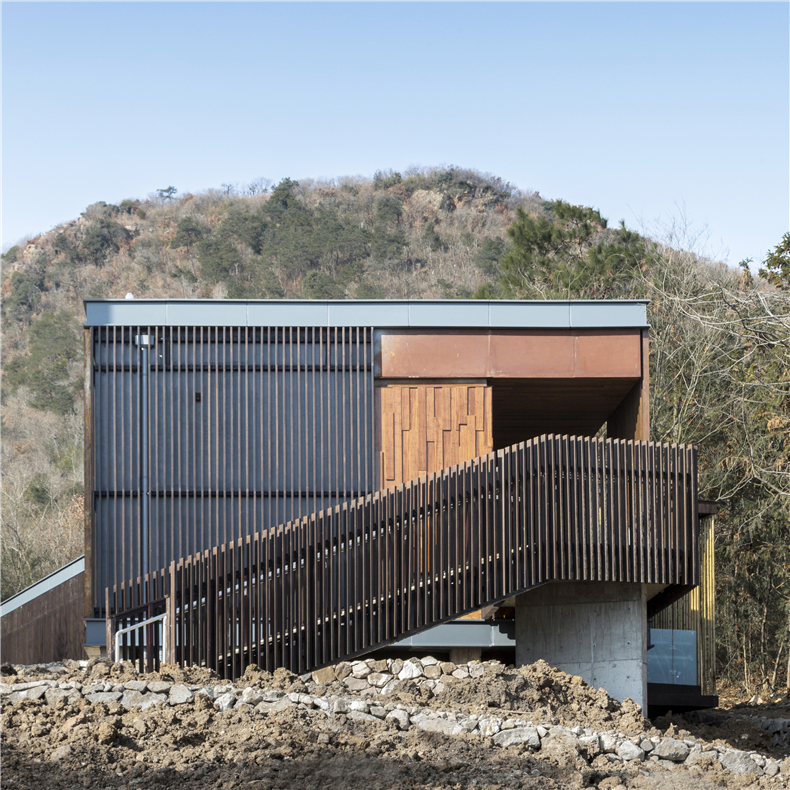 在由一段耐候锈钢板折线式自行车爬坡道来到坡顶之后,这里有一处垭口,垭口的观景台可鸟瞰牛首山西的广袤平原。从垭口回望,就是厕所的位置了。以“垭口”为主题,建筑立面仿佛被撕开一道口子,切面棱角分明,宽敞的灰空间为人提供了休息、观景之处。