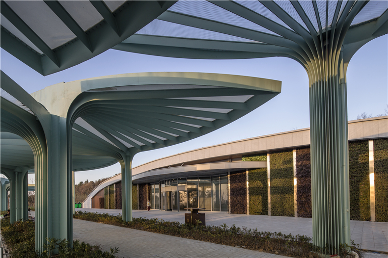 公厕主要是供参观完主景点的游人在游览车停车场候车时使用,游览车排队候车区的站篷也同为工作室设计,覆盖面积约900平方米的站篷采用了错落层叠的钢膜结构,造型取自佛教中具有隐喻性的菩提叶。