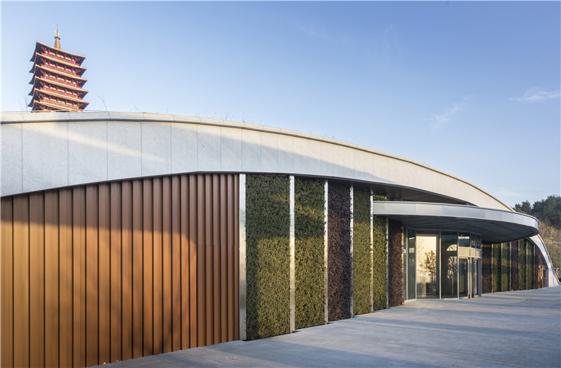 作为佛顶宫的游人集散乘车的配套设施,为了使近500平方米的建筑在佛塔脚下尽量的退避,设计希望建筑以匍匐的姿态“谦卑”地出现,建筑逐渐从草地中隆起。立面采用垂直绿化墙的形式,层层退进与弧形的雨棚形成建筑主入口。