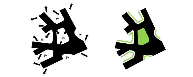 在开始阶段,建筑师便希望在城市综合体的类型上进行突破。首先,利用基地的参数价值确定高密度建筑以及核心交通体的位置,使得建筑物在规划层面上实现便捷高效的流线设计。其次,根据使用需要进行分层设计:底层商业空间以传统城市街坊的尺度进行布置,叠加小型办公空间在其上方形成小尺度空间。此外,分别在9米3和24米标高植入覆盖园区公共平台层,容纳上部办公建筑人流和下部进入建筑的人流。