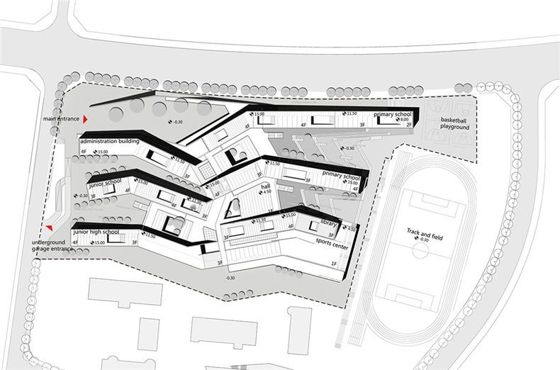 场地周边的山峦连绵起伏,建筑师希望主体建筑物可以融入所处地理环境。地面缓缓升起的建筑物,通过屋顶台阶及斜坡处理手法,屋顶与地面均成为景观的元素。拾级而上,不知不觉步入建筑,起伏的建筑随着游走而层层呈现。