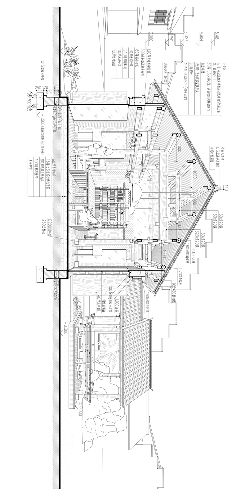 屋架采取传统中国的木构做法,建筑师希望它的形式能回溯传统地方性格,呈现江南本土的建造体系。设计参考了皖南、婺源乡村里的一些公共建筑,如路亭、廊桥等,这些乡村建筑类型是过去江南乡村普遍存在的,只不过因交通不便等原因,这些建筑在皖南和婺源得以保留下来,基本可以把它们理解成江南乡村过去普遍的样子。