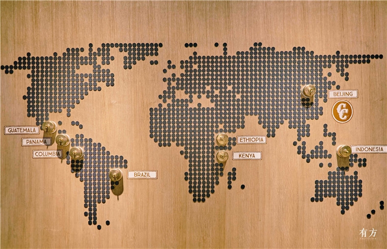 Positioned at the far-end of the bar counter, the large world map of coffee production areas not only acts as a visual backdrop but also serves as the main control panel of lighting switches. The position of each light switch is located at an important area of coffee production, with the one exception being Beijing, the home of Coffee Craft.