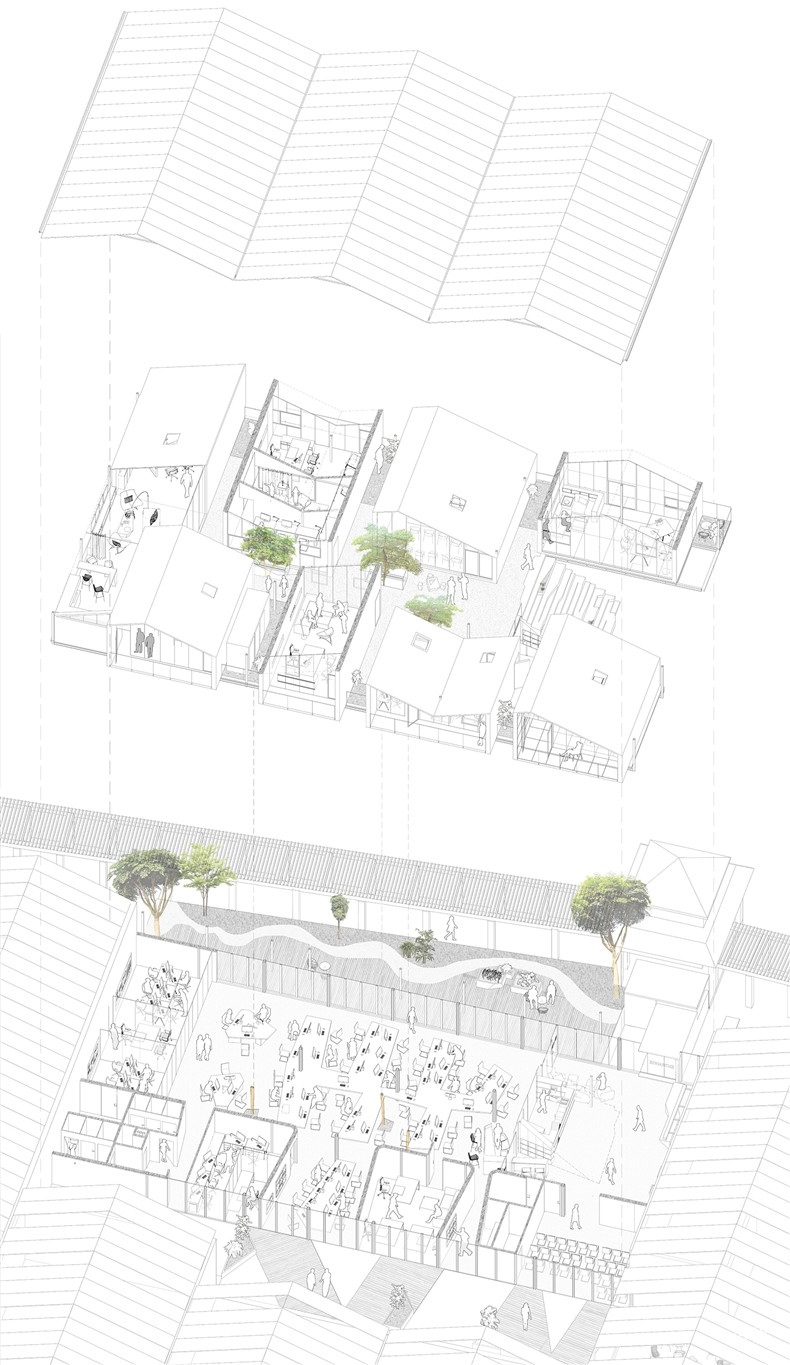 The architect planned to construct an intimate and small-village-like work environment under the plant-house’s original building skin, maintaining the natural daylight and ventilation in the new working cluster to achieve a low-energy-cost green spatial infill.