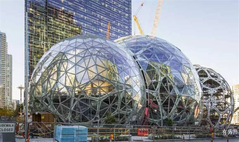 NBBJ 为亚马逊的西雅图总部设计了三座钢化玻璃与低能电子衍射科技打造的低能耗穹顶温室“球体”(Sphere)。其内部将种植来自世界不同地区的 3,000 种植物,亚马逊的员工将在这座穹顶温室内相遇、交流、享用午餐。球体设计也连接起了亚马逊的办公塔楼,整体工程预计将于 2021 年完工。