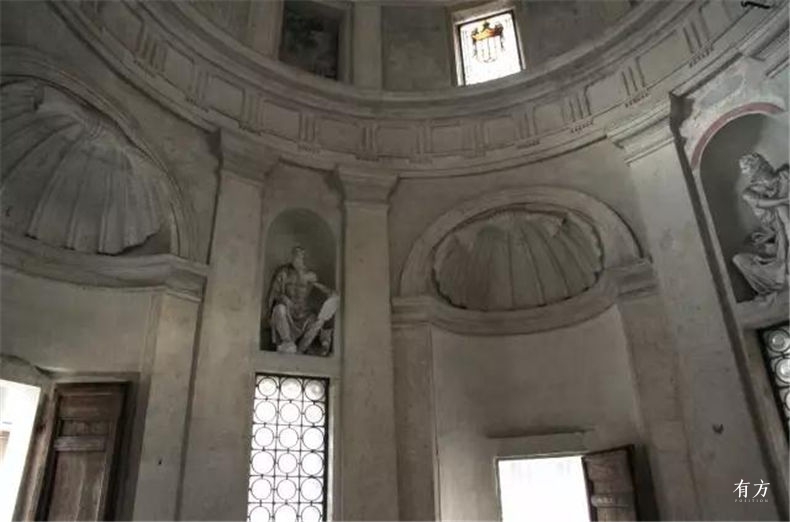 但在坦比哀多,半球形穹顶完全由承重墙承重,并且高出由外围柱廊形成的环形结构,外围柱廊支撑二层栏杆和栏杆下的檐部,独立成体系,我们暂称其为“外环系统”。在内室的外墙面,壁柱(一半嵌入墙内的方柱,pilaster)对应外环柱廊的多利克柱分布,在壁柱间,通过设置壳形小龛和小方窗来减轻承重墙的厚度,使其减轻承重结构多余的部分,使建筑更经济的同时创造一种立面的韵律。同时,内墙也遵循外墙的秩序布置,墙体内外的相错嵌入,这样,墙体在平面上看起来更像是交错排布的“承重柱”,而不是我们在古罗马圆厅中所见的普通的“墙”。