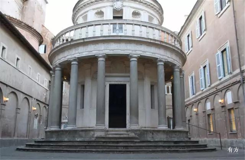 我们可以想像,600年前的伯拉孟特在面对这座空旷、窄小的院子时,诗意的场景和宏伟的构图曾以怎样的姿态在他的脑海中呈现。在600年后的这幅现实场景中,透视使得坦比哀多的实际视角比它的建筑正立面要缓和舒适得多。伯拉孟特笔下的立面来自真实的透视效果。因此,当今天我们站在这座小庭院的正门前,仰视着圣徒彼得的坦比哀多礼拜堂,眼里尽是和谐而细腻的比例之美。