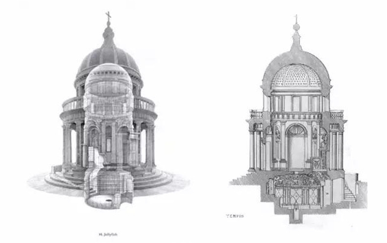 总的来说,坦比哀多就是由这两部分一外一内的圆形平面组成的,较矮的柱廊外环包裹着高耸的穹顶内环。这是伯拉孟特设计坦比哀多最基本的秩序形式。即便在今天看来这似乎就是最为常见的“西洋风格”,但在文艺复兴中早期,坦比哀多的这一形式是完全突破了古罗马原型建筑的创新之举。(详见上篇)