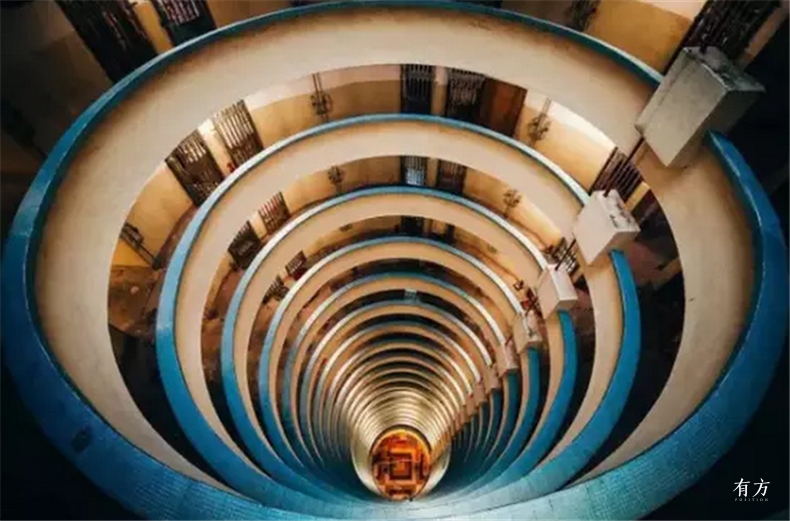 从下仰望,盘旋的圆,见不到锋利的锐角,宛若时空隧道。