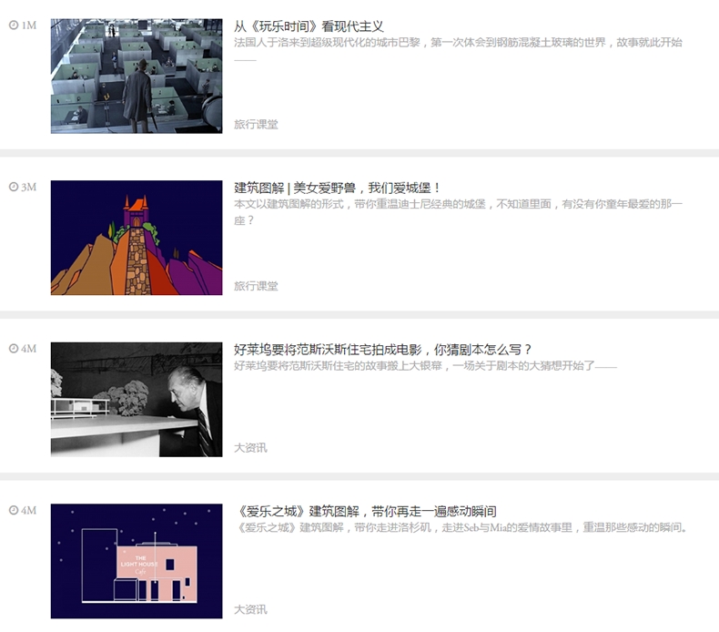 “大资讯”“建筑地图”“旅行推荐”等栏目提供全球范围内新鲜有趣、实效实用的建筑/旅行资讯,“建筑绘”“建筑摄影”“电影与建筑”等栏目共赏生活中关于建筑与旅行的美好作品,“故事”栏目分享你城市旅行、观察建筑的体会,“旅行现场”则展现有方自身的旅行考察模样。