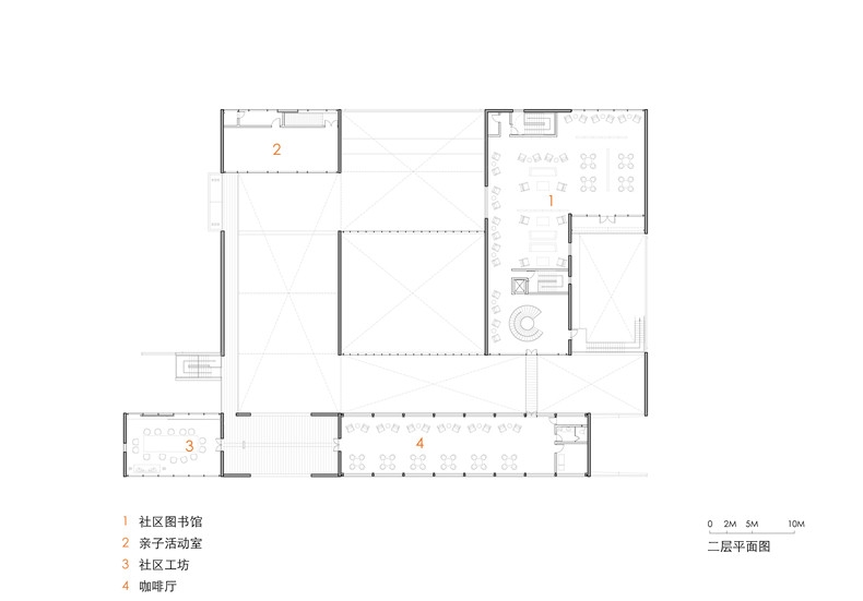 设计在建筑靠西的位置设计了一条南北向的主要步行通道,小区居民走出围墙后,将使用这条步道穿过社区中心,前往南侧的巴士站或湿地公园。建筑的东南角提供了另外一条步行通道,连接东侧的小型商业庭院,并向西穿过水景庭院与主通道相连。沿着主通道,在靠近城市道路的西南角设置了一家进出行人都会经过的便利店,在靠近小区的北端设置了亲子游戏室,主通道在建筑中部扩大,成为一个半室外的社区广场,向西面对草坪庭院,向东则可以进入社区中心的多功能大堂,这里可以举办艺术展览和各种社区活动,也是通往其它内部空间的枢纽:通过下沉庭院采光的地下室是一座健身中心,与小区地下室连通;一层提供了社区事务管理、小型商业和居民的交流空间;二层是社区图书馆和工作室,在朝南的咖啡厅可以享受湿地公园的景观。