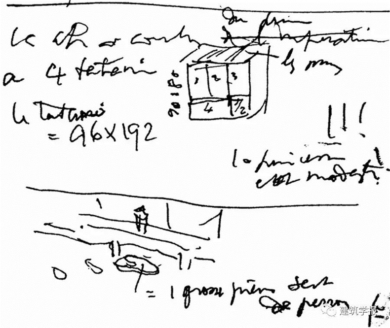 柯布用他惯用的草图结合文字(法文)的方式,在速写本上记录下了参观桂离宫的部分所见所感:以“京都桂离宫”作为整页记录的标题,柯布记录了庭园中一种苔藓(Sugi-goke)的名称,并在下方释义:“因为它看起来像柳杉而得名”。同时,柯布绘制了一幅表现土桥表面肌理构成的剖面示意图(侧边隆起部分种有苔藓,台阶表面铺有碎石),并略带戏谑地在上方写道:“如有可能,带一点回去用在钢筋混凝土上”。柯布还以轴测图的形式绘制了一间房间,示意了其中榻榻米的划分,并对4叠半榻榻米进行了编号。在这幅草图旁,柯布写道“四叠榻榻米的亲王卧室 / 一叠榻榻米=96×192/!!!亲王夫人真简朴”。除此之外,柯布还绘制了一幅缘侧(外廊)空间的速写,并在一旁标注“一块大石头作为台阶”。另一幅相对细致的速写则是对桂离宫万字亭内部空间的记录——靠近4根立柱呈卐字形分布了4条长凳,一条供人通过的道路穿过其中。柯布还在下方绘制了其平面的示意图,在一侧注明“露天庭园中的休息空间”。