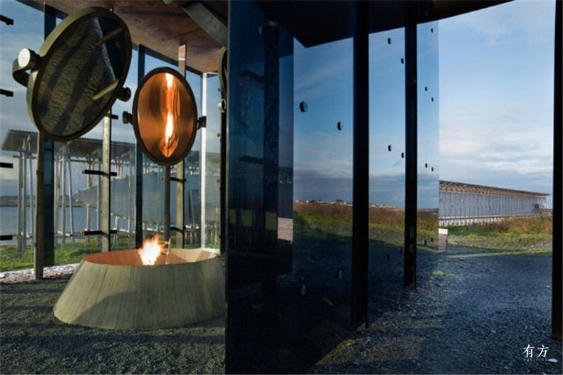 这座服务性建筑位于Skjervsfossen瀑布不远处,洗手间里朝向景观的一面使用了玻璃材料,游客在使用洗手间的同时可以享受绝美的自然风光。