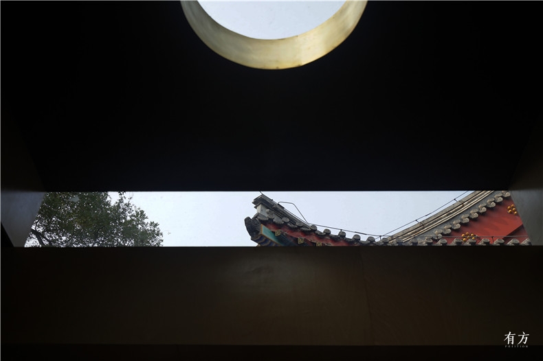 建筑内部有三处天窗。中区入口处的天窗,提示原始场地为院落的属性;建筑南区与原始建筑山墙面间的缝隙,可以让微弱的光线渗透进来,经由墙面的铜板反射到阴翳的室内;在北墙的尽头,地面的水磨石延伸到墙面并指向天空,透过完整的玻璃屋顶可以看到院外的树影与天色。