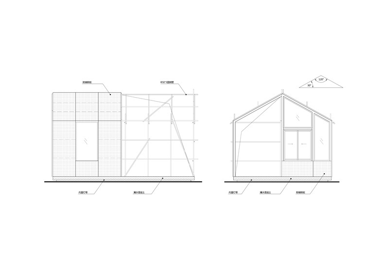 在整理场地的过程中,设计团队将沿街临时性的房屋进行拆除,同时保留西北角较为完整的砖混结构小屋;并以该小屋的尺度作为设计依据,在腾出的场地中,植入四个由钢骨、耐候钢板、钢板网、玻璃、钢管脚手架组成的“工业小屋”。
