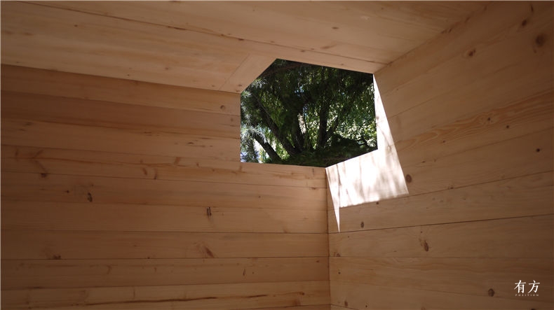 “小屋”是介于装置与建筑之间的暧昧存在,它像是一个扩大的家具,同时也像是一个拥有建筑特征的房子,这和中国传统四合院建筑中的床是一样的。2.4米立方的方体四个角被切掉,形成了窗和门洞,让光线可以从不同方向进入空间,像是一个光线的盒子,通过光线的变化可以感知时间的变化,从内部透过不同的洞口可以看到不同角度的天空与风景。