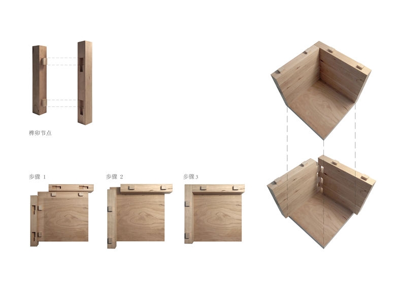 整个装置利用传统的木材榫卯技术,不使用任何金属连接,通过拼接的方式搭建出了一个可以移动的“小屋”。一种构造方式便可以把整个小屋搭建起来,并且构件被切分成了便于搬运和安装的尺寸,拼接的肌理和材料的截面被原始的表达。当小屋不再承担它的功能后,这些构件可以被加工成其它木质产品,实现可循环再生使用。