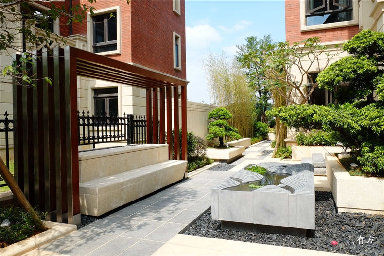“精雕细琢,见微知著”,设计师希望庭院可以成为生活的一部分。庭院不仅承担常规的观赏功能,也要补充建筑以外的功能。在设计中尝试淡化景观和建筑的边界,更好地将两者结合在一起:通过现代的设计手法,将自然的山水浓缩于庭院中,成为一个别致的景观。园中精雕细刻的山河砚,再现山重水复,将自然山水藏于庭院之中,营造“庭院静,空相忆”的空灵之感。苍劲松枝,月影照璧,令人遥想“明月松间照,清泉石上流”的诗意。