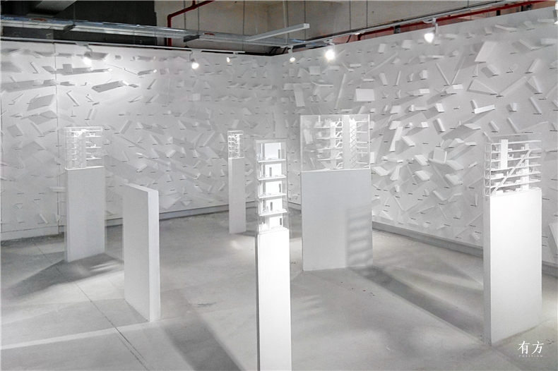 展览的形式是在散落的展台上放置缺陷住宅的设计模型,以及将白色的体量模型垂直于墙面,密密麻麻地满铺。也许是为了让这种“尖锐”更为均质,策展人特地调整了体块的比例,有的是1:100,有的则是1:200。因此我们可以推断相较于比较严谨的调查展现,这里也许更加倾向于一个态度的呈现,企图用这种“均质的尖锐”去刺痛观者,仿佛一场沉默的呐喊。