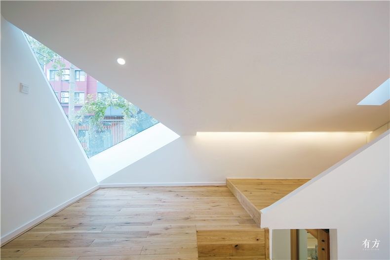 The new building foundation is dug below 2 meters, so as to effectively avoid the damage caused by frost expansion on the frozen soil layer. The new house is designedas a very wrapped mass, an extra 15cm insulation is added to the foundation, the wall and the roof, which fundamentally solves the problem of stability and cold. In the face of construction in the high latitudes warmth retention property, the sun is one of the most important factors. Due to the fact that the orientation of the land plot not facing south and north, and is blocked by the surrounding high-rise buildings, it can not get a good angle of sunlight. Therefore, the design of the new building cuts a triangular opening in the direction of the south, which can guarantee that the whole house has at least three hours of sunshine in the winter, thus to improve the residential comfort of the whole house.Southe gables adopted traditional Shou-Sugi-Ban, and northe gable wall adopted Nippon composited board with better thermal insulation and heat preservation.The main body of the building including roof and wall iscontinually covered by titanium zinc plate, which can effectively avoid the snow cover in roof and reduce the maintenance cost of the owner in the future.