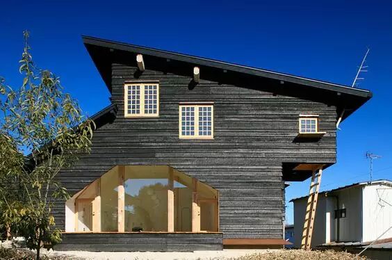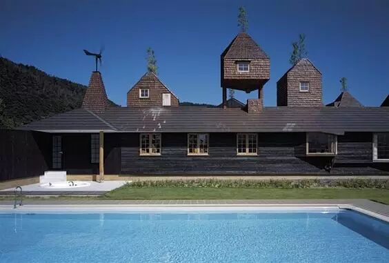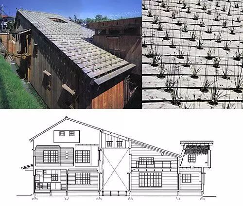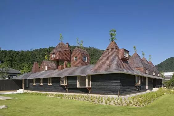 藤森的房子多少有点像小孩玩泥巴,基本遵循建筑学的形式几何、空间流线、功能布局的基础上,寻找突破和自然亲近。神长官守矢史料馆和秋野不矩美术馆外墙用土色的灰浆混入切碎的麦秆涂抹,之后再抹一层土。韭菜之家的铜板屋顶上做预埋花盆种植韭菜。室内是清一色的灰泥和杉木板。还有标志性的穿过屋顶的自然形态木柱,黑色的烧杉板饰面,室内留着砍削痕迹的栗木柱,有日本传统茶室数寄屋中昂贵的自然“中柱”的影子,以及废弃的宣纸糊墙渐渐变黑的传统。