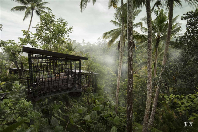 酒店选址地为巴厘岛典型的河谷地带,公共区域均分布在河谷边缘,与周边的大自然美妙地结合在一起。沿着河谷的最高处,景观设计师长谷川基于一条古老的河道设计了独特的木栈道—— 一种巴厘岛传统的灌溉系统subak带来的灵感。客人刚踏上这条位于酒店接待处之上的木栈道时,场景立刻转换成巴厘岛热带丛林。一系列鸟笼状的咖啡凉亭架在木栈道上方,在那里,住客可放松身心,并享受周围大自然的瑰丽景色。