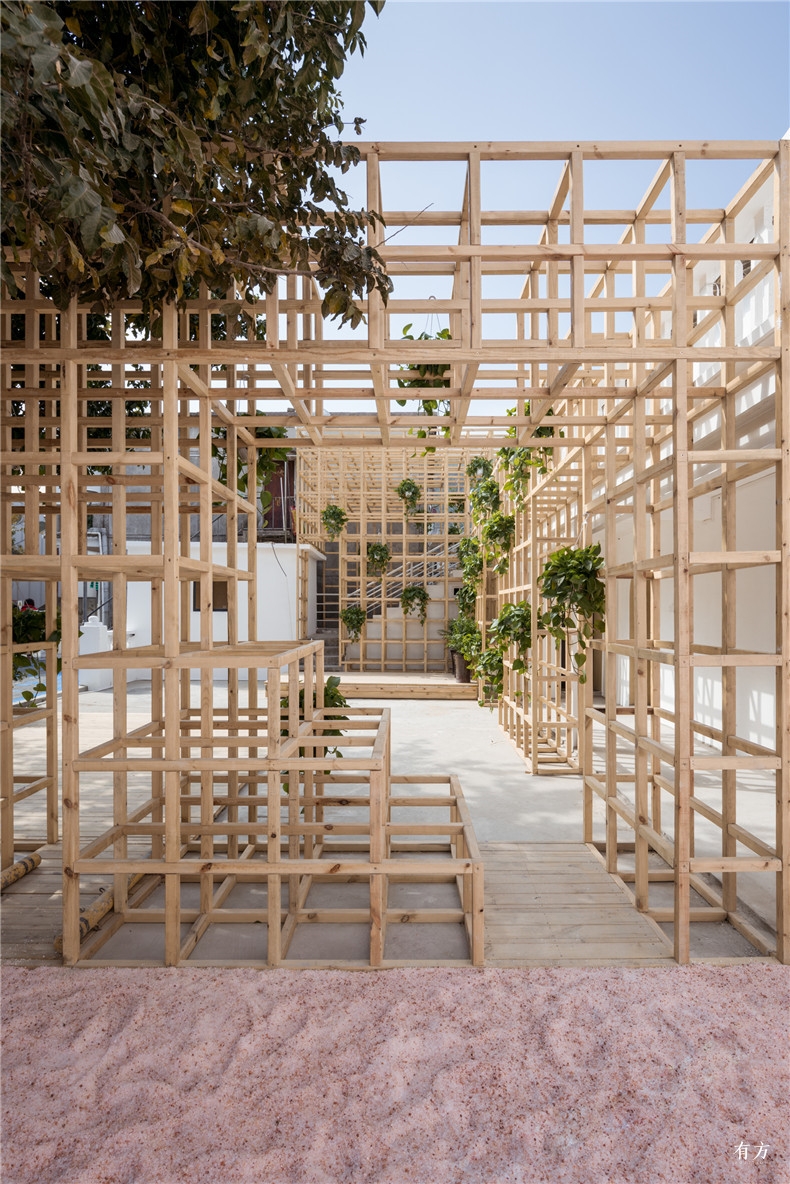 我们的改造首先是拆除原有非承重墙体,清理出基本的空间结构,保留并进行了一些梳理。恢复了建筑底层和庭院间的原有门廊。为了强化门廊、院子、楼梯的公共性,加建了一个轻型的木格构花架,其上可攀缘植物,可用于儿童攀爬、游客座榻,同时也作为大庭院的分隔,和隔壁庭院既能共通也有限定。