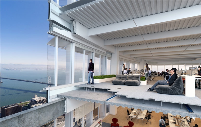Salesforce塔楼的设计旨在满足目前高科技创新企业的使用需求,并考虑到了未来行业、技术、环境的变化,采用了架高地板、高性能玻璃幕墙、灵活分割组合的办公室格局。在办公室内引入部分绿植,构建人、建筑、自然之间的联系与平衡。