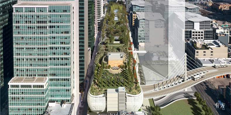 客运中心在横跨5个街区的同时,仍保持路面街道的畅通,面向公众开放的屋顶公园将开设多于12个入口点,并可与周围建筑通过连桥互通。塔楼和客运中心直接连通,更是围合出一个新的街面广场“Mission Square”,鼓励建筑与城市的共生。